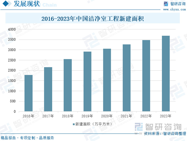 目前,全球半導體、光電等電子信息產(chǎn)業(yè)在世界范圍內轉移,東亞、東南亞等地區(qū)已成為世界電子信息行業(yè)的主要市場和發(fā)展重心;同時由于我國醫(yī)藥衛(wèi)生、半導體、航空航天等事業(yè)的不斷發(fā)展,加速推動了潔凈室的市場化需求,從而帶動我國潔凈室工程產(chǎn)業(yè)的快速發(fā)展。2023年,中國潔凈室工程新建面積達3689萬平方米,同比增長6.04%。