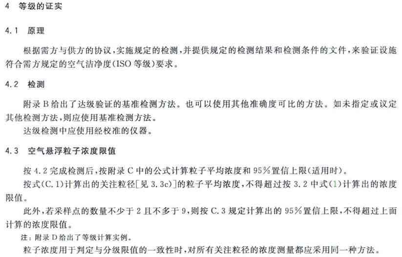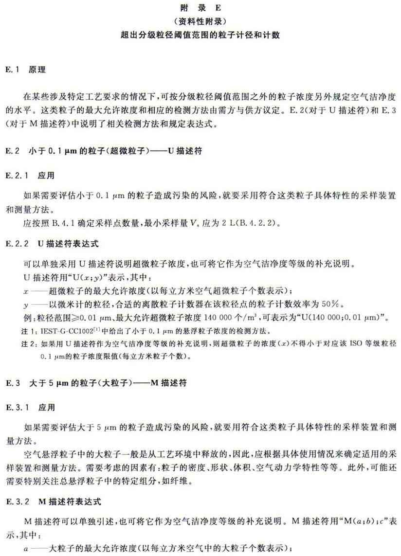 GB/T25915的本部分劃分潔凈室及相關(guān)受控環(huán)境的空氣潔凈度等級(jí)僅依據(jù)其內(nèi)的空氣懸浮粒子濃度,該濃度系指粒徑大于或扥估閾值(低限)粒徑為0.1μm~5μm規(guī)定粒徑以外粒子總數(shù)的潔凈度等級(jí)。但可以用U描述符合M描述符,分別表述超微粒子(<0.1μm)和大粒子(>5μm)的總數(shù)。