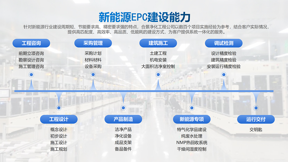 合景智慧建設(shè)是工業(yè)高端制造領(lǐng)域生產(chǎn)車(chē)間建設(shè)高潔凈度和低露點(diǎn)凈化車(chē)間內(nèi)裝工程的規(guī)劃、設(shè)計(jì)、采購(gòu)、施工與服務(wù)一體化總承包商,多年來(lái),在大型廠房建設(shè)方面積累了大量豐富的低凈化車(chē)間內(nèi)裝工程設(shè)計(jì)和施工經(jīng)驗(yàn),特別是在產(chǎn)能規(guī)劃、公用工程、環(huán)境工程(溫度、低露點(diǎn)、高潔凈度)等領(lǐng)域的制造、工藝流程、節(jié)能環(huán)保等提供完善的系統(tǒng)集成工程建設(shè)解決方案。